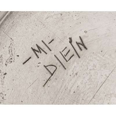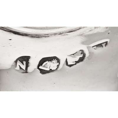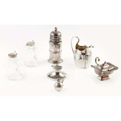 Murrle Bennett & Co, Birmingham 1912, of traditional form, cut glass base; together with an Irish cream jug, an inkstand, Birmingham 1918, a pepper pot shaped as a Jersey milk jug, Birmingham, a plated mustard pot and sugar caster (6)