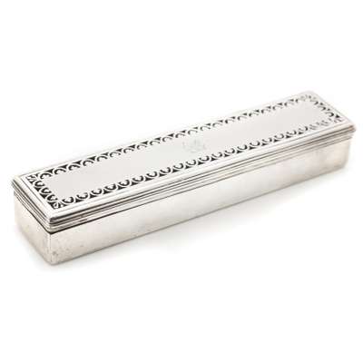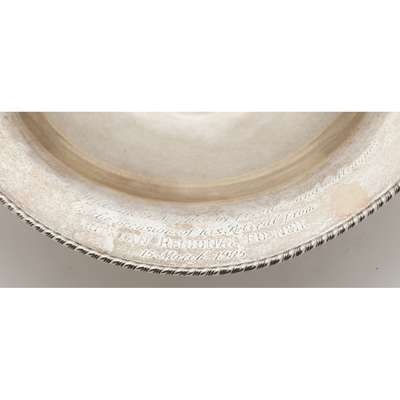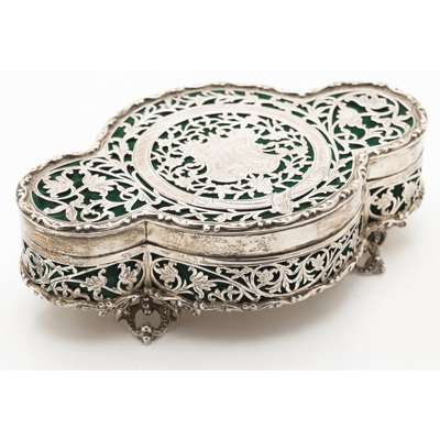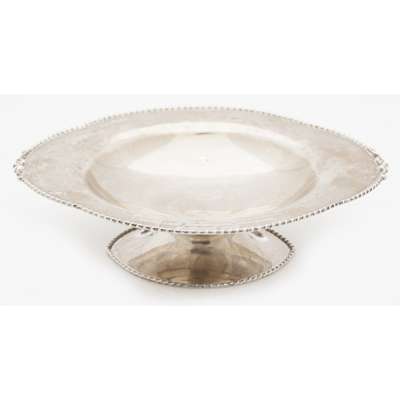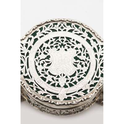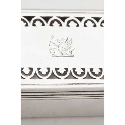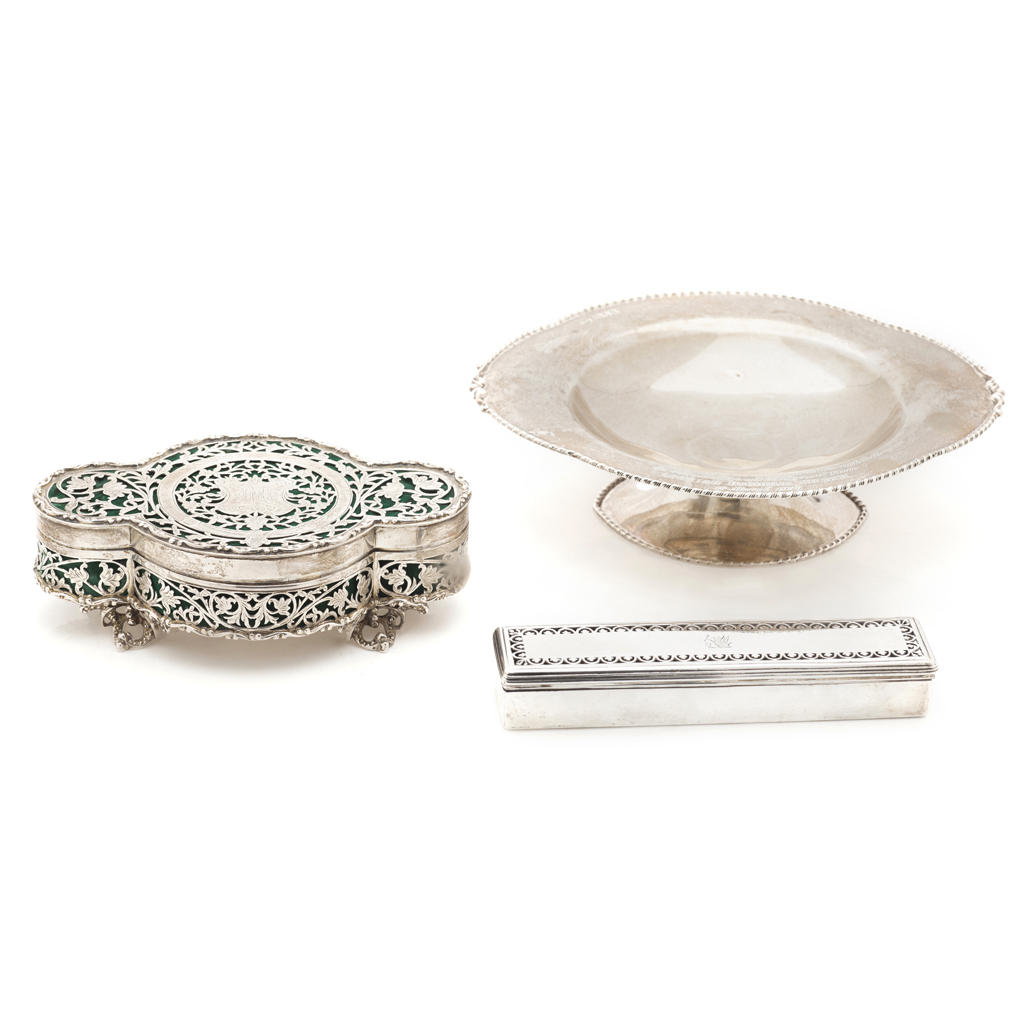 George Nathan & Ridley Hayes, Chester 1913, of pierced oval form with green velvet lining; together with a tazza, Josiah Williams & Co, 1920, of oval form, reeded border, later inscription to front, raised on a shallow foot; together with; a small silver box, WP, 1811, of rectangular form, open fretwork border (3)