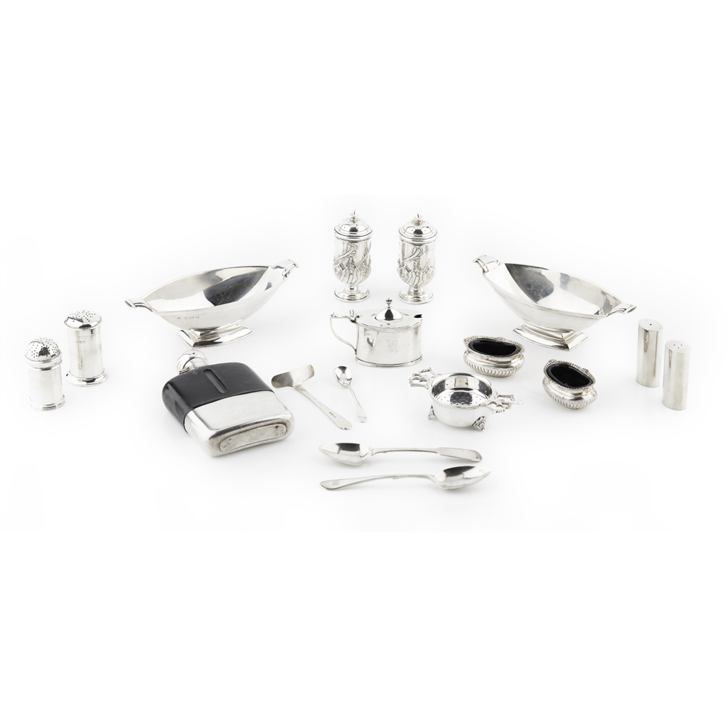 to include a pair of lobed dishes, Adie Brothers Ltd., Birmingham 1931, of stylised Art Deco form; a silver mounted hip flask, JR., Sheffield, 1933, domed hinged lid and leather detail to body; a tea strainer, Adie Brothers Ltd., Birmingham 1936; together with miscellaneous condiments, some with blue glass liners and teaspoons and a white metal cruet set (qty)
