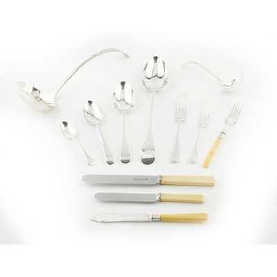 various dates and makers, of Old English pattern, to include one soup ladle, two serving spoons, eight tablespoons; eight tableforks, nine dessert forks; ten dessert spoons, ten teaspoons; six ivory handled fish knives, eight ivory handled fish forks; together with various ivory handled knives and carving set, in a two drawer and hinged top fitted canteen (qty)