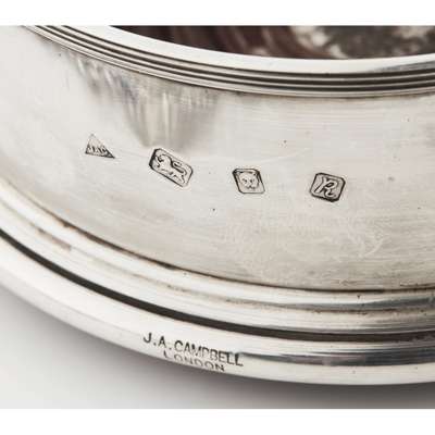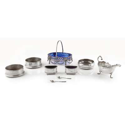 to include a pair of wine coasters, J.A. Campbell, London 1991 and another B & Co., Birmingham 1987; a pair of salts, Birmingham, with spoons; a swing handled basket, William Gibson & John Langman, London 1898 with blue glass liner (qty)