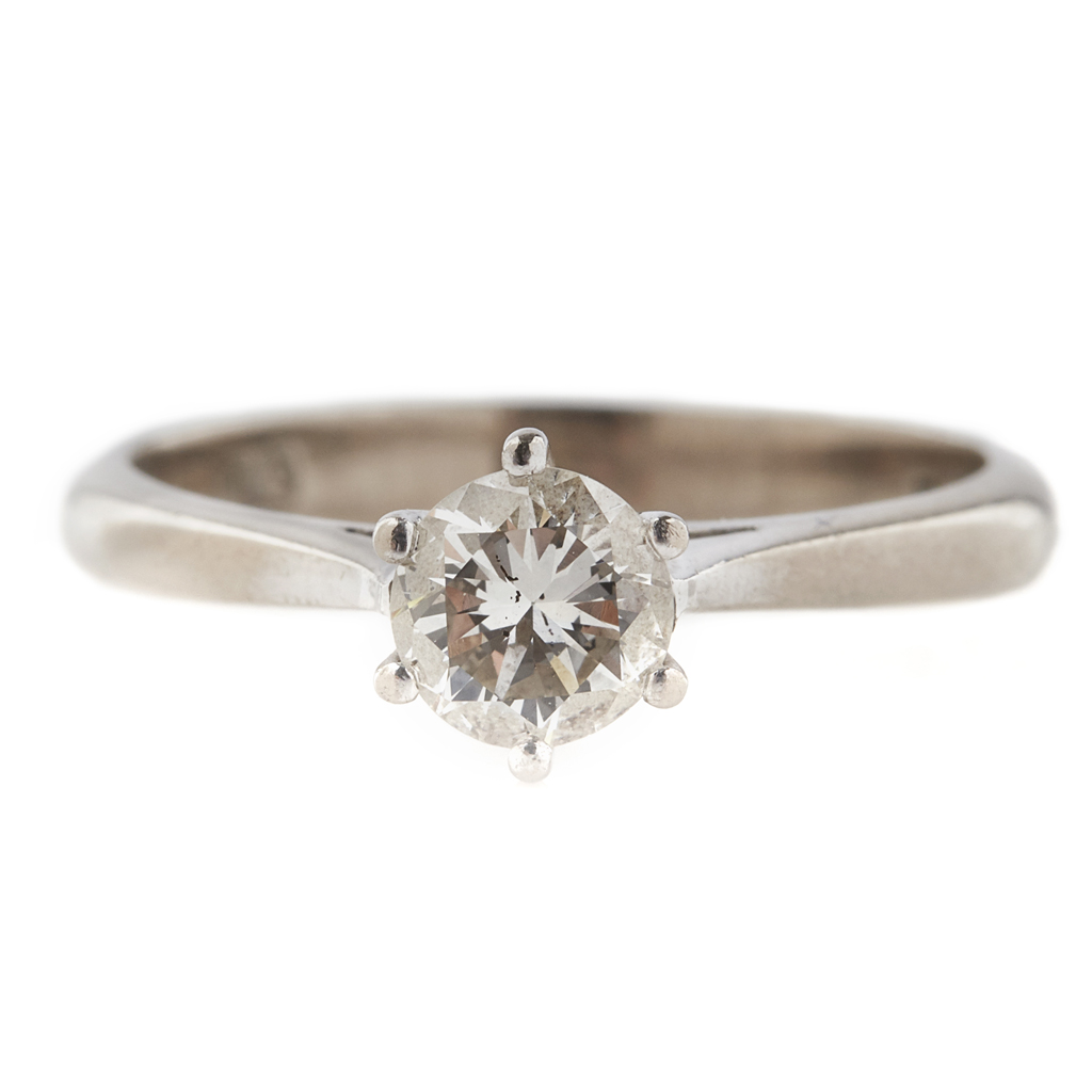 claw set with a round brilliant cut diamond, to an 18ct white gold band