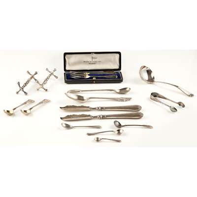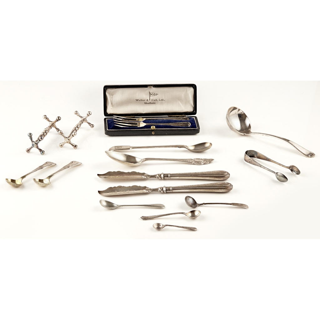 Mackay & Chisholm, Edinburgh 1834, of Fiddle and Shell pattern; together with two sugar tongs, Millidge & Son, Edinburgh various dates of King's pattern, four condiment spoons James McKay, Edinburgh 1841 of single struck Queen's pattern; together with two silver bladed fish knives London, a set of pickle forks, Birmingham, a toddy ladle, a collection of miscellaneous condiment spoons and miscellaneous plated items (qty)