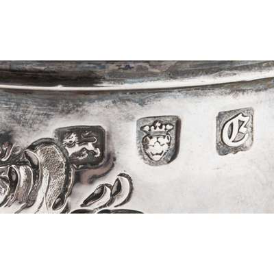 P. Pilleau (probably), London 1762, of baluster form with floral and swag embossed decoration, S scroll wooden handle, fluted leaf capped spout, fruiting bud finial