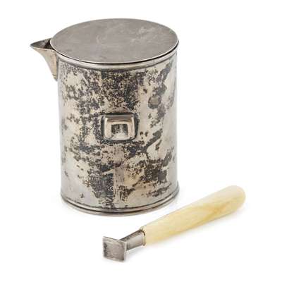 ID AD, London 1821, of cylindrical form, sparrow beak, removable ivory handle and pull off lid, crest and motto to side