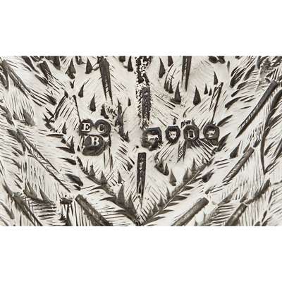 Richards and Brown (Edward Charles Brown), London 1869-1871, each well modelled and comprising; a large mustard pot and hinged cover with liner, a pair of pepperettes; a single pepperette or salt, each with original glass eyes, gilt interiors, mustard with glass liner