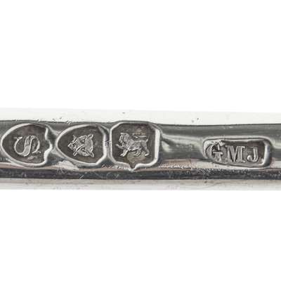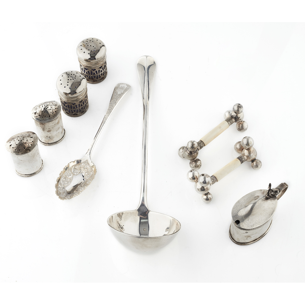 to include a soup ladle, George Maudsley Jackson, London 1893, of Hanoverian pattern, crest to reverse of terminal; a berry spoon, Atkins, Sheffield 1893; together with a collection of condiments, two carving rests, a white metal belt and a punch ladle (qty)