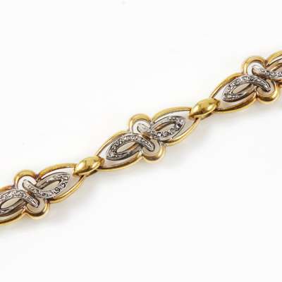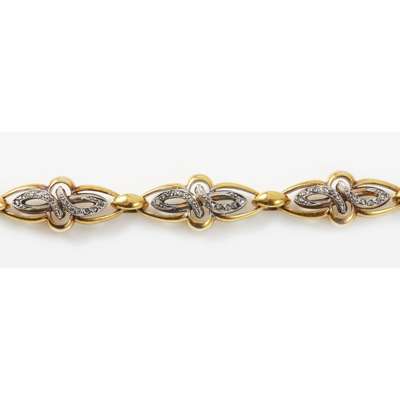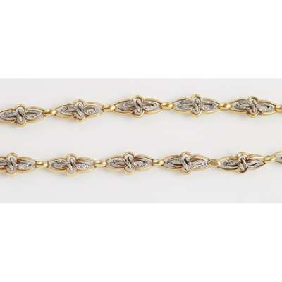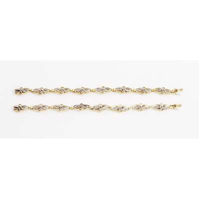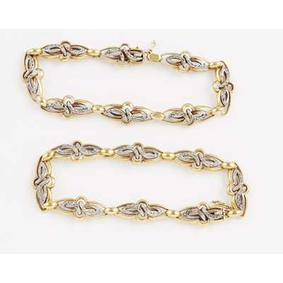 indistinct control marks and numbered 1720, maker MD, each bracelet composed of elongated links in yellow gold and central white gold scroll motifs set rose cut diamonds, can be joined to form a collar necklace, with safety clasps