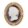 the oval hardstone cameo depicting a woman in profile, in a blue and white enamelled surround with floral detail, the outer border with beaded detail, unmarked