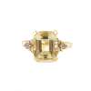 claw set with an oval cushion cut yellow sapphire, flanked to either side by three small round brilliant cut diamonds, to a plain yellow metal shank stamped 750