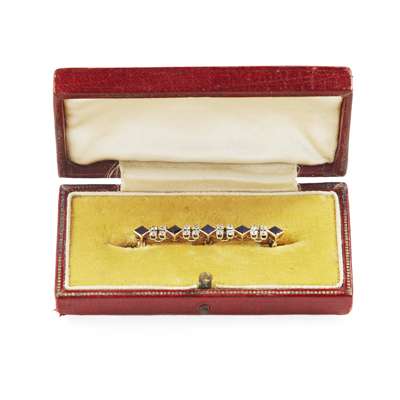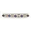 collet set with five square cut sapphires, between clusters of claw set round brilliant cut diamonds, pin indistinctly marked