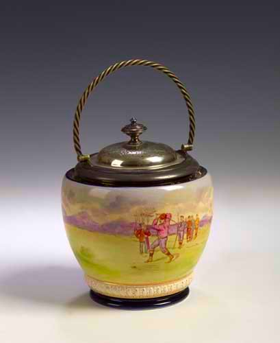 with ropetwist gilt metal handle and silver lid with opposed panels of two golfers, one about to drive off and a caddy with mountains beyond, Registered no: 247274 and B1302 in red