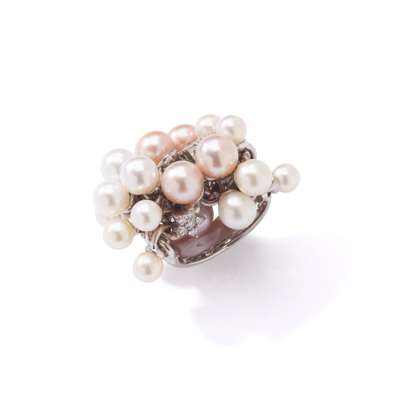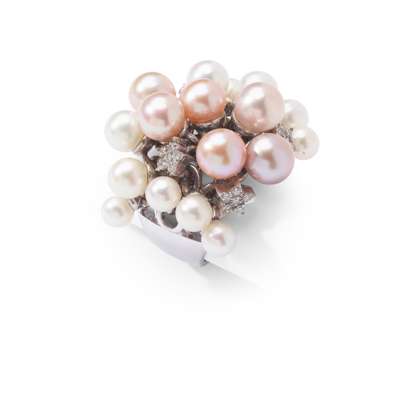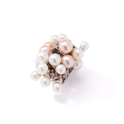 The chain-link front suspending a tassel of white and pink cultured pearls and diamond-set star motifs