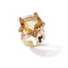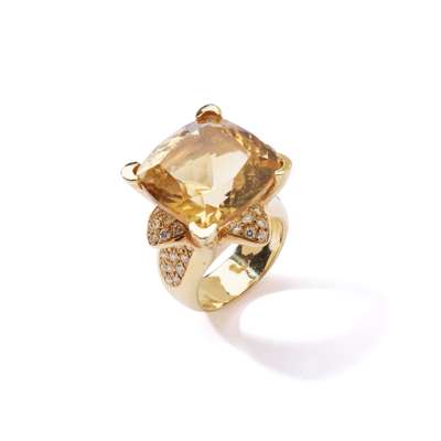 The square cushion-shaped citrine, to a quatrefoil surround and shoulders, pavé-set with brilliant-cut diamonds