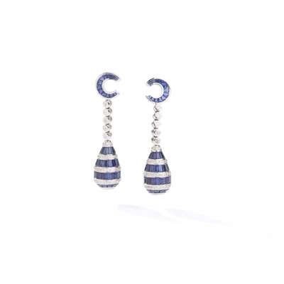 Each drop set with alternating lines of brilliant-cut diamonds and calibré-cut sapphires, to a collet-set diamond line connection and calibré sapphire-set sickle-shaped surmount, post fittings