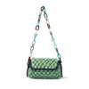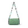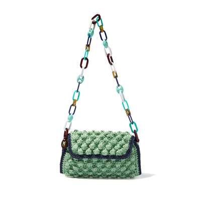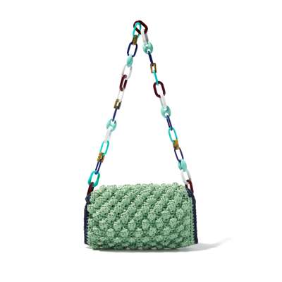 Turquoise raffia bubble stitch knit with navy trim, with multicoloured plexiglass shoulder strap