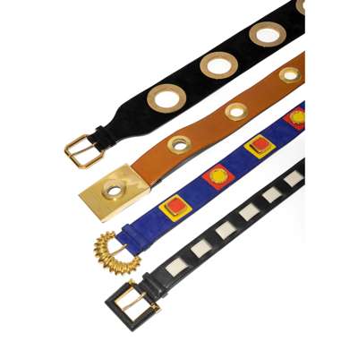 One blue suede with red and yellow leather, size 38; one tan with a rectangular gold-tone buckle, size 40; one black and white, size 40 and one black suede with large gold tone rivets, size 38