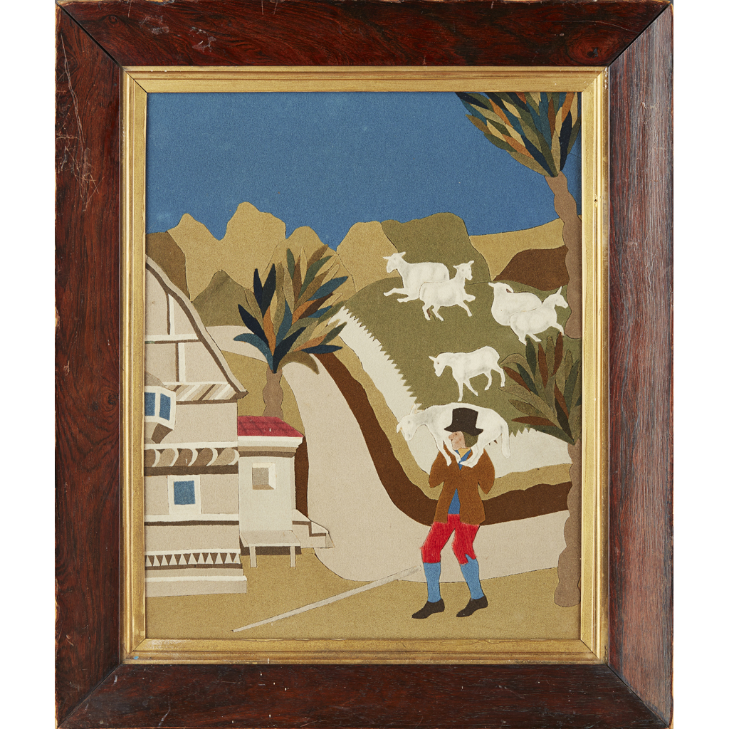 depicting a man carrying a sheep on his shoulders in the foreground, with sheep on the hillside, original frame