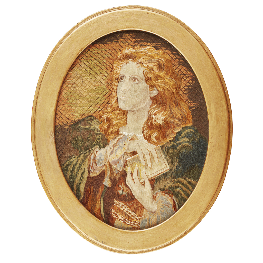 worked as a representation of 'Souls Awakening' by James Sant (painted 1894), original frame, bears inscriptions verso V. H. WISE/ 7 BOW LANE, N.12/ 1925/ MISS WISE/ROYAL SCHOOL OF NEEDLEWORK/ 25 PRINCES GATE/ KENSINGTON S.W.7/ SHOWN AT THE LOAN EXHIBITION ST JAMES PALACE 1951/ 'SOULS AWAKENING' AFTER SANT, with original exhibition catalogue (2)