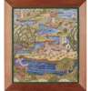 depicting a meandering river scene, worked in coloured wool and silk on a linen ground, original frame