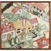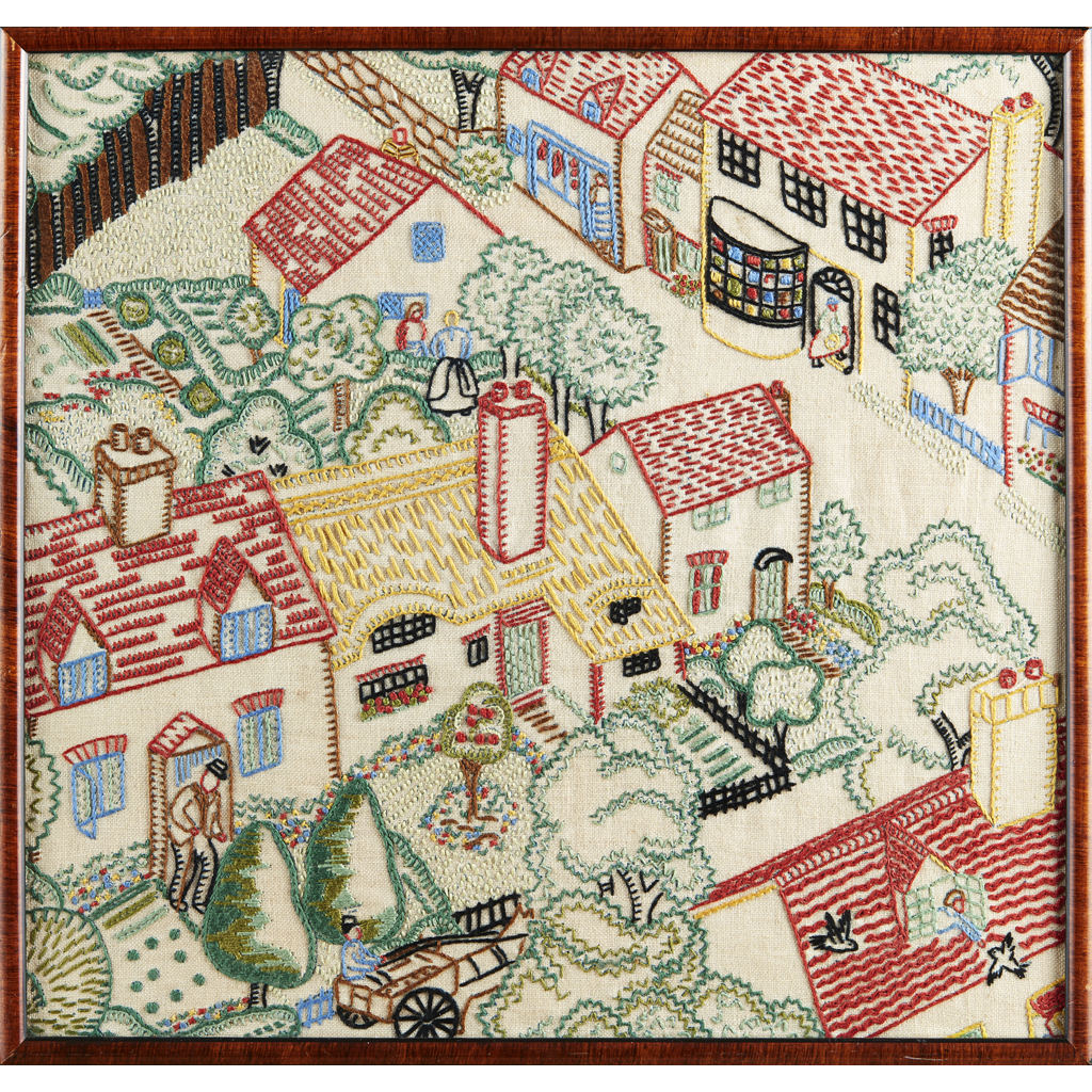 depicting an aerial perspective of an English village, cotton threads on linen, original frame