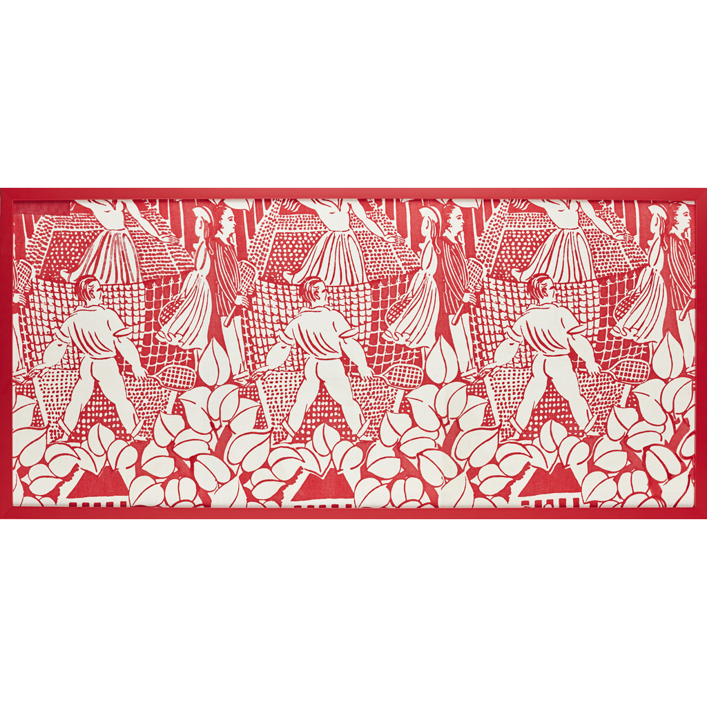depicting a repeating pattern of tennis players, hand blocked print on heavy cotton, framed