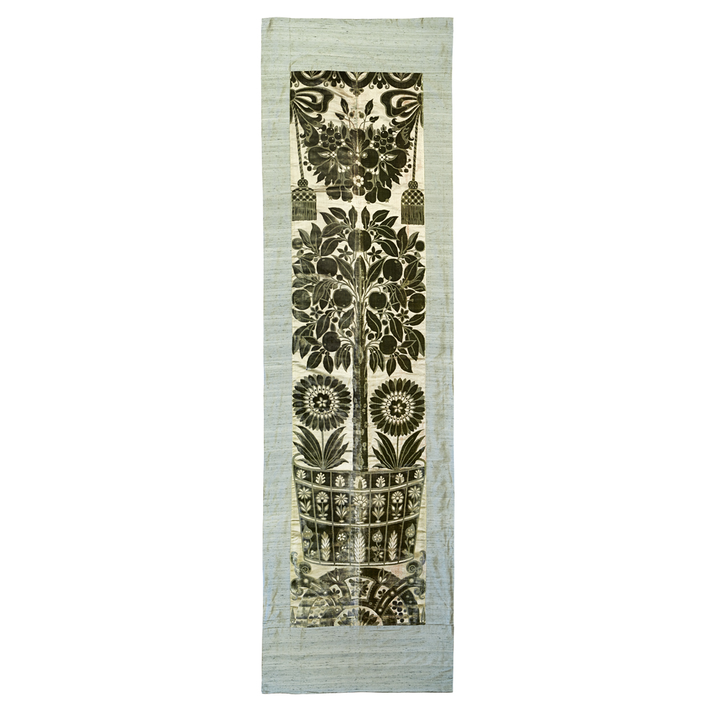 in the mid-17th century style, depicting a potted fruiting tree with flowers and hanging tassels, with later silk border