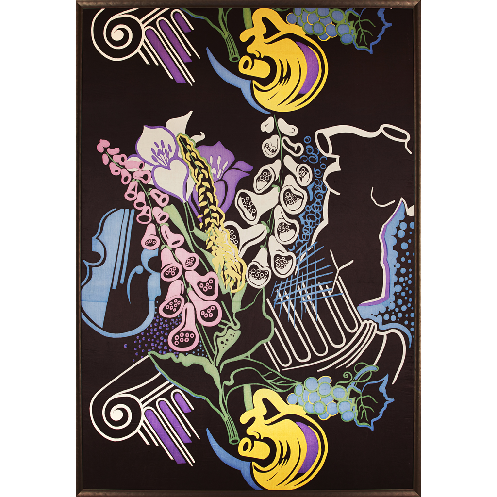 with repeat still-life pattern, reserved on a black ground, framed