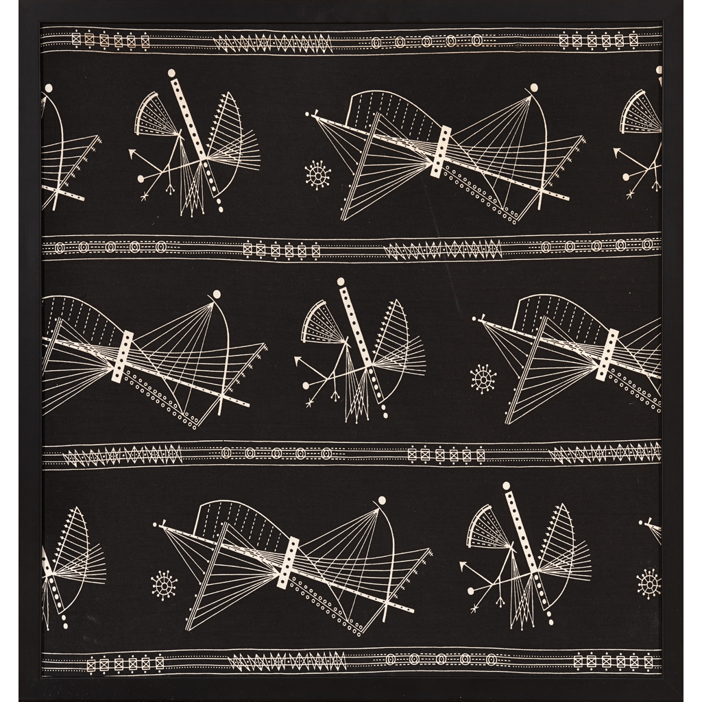Note: During the 1950s, Mary Warren designed furnishing fabrics for Heal's Wholesale and Export Ltd. in London. Her work typically comprises of abstract and geometric forms on screen-printed cotton. The title 'Nautilus' comes from the name of a marine mollusc and is also the name of numerous historic ships, which alludes to the pattern suggestive of ship rigging and navigational equipment in this panel.