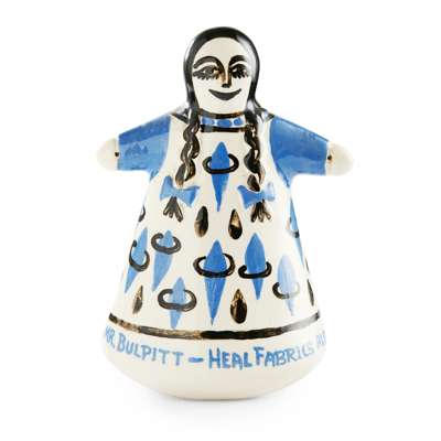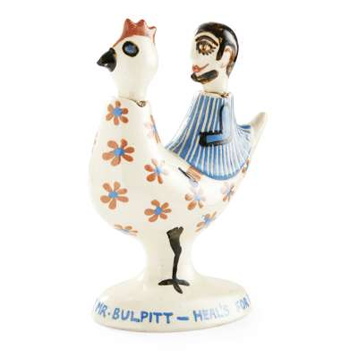 one modelled as a man riding a chicken, with nodding head, bearing inscription YES, MR BULPITT/ HEAL'S FOR FABRICS and with maker's marks to the interior MEVAGISSY POTTERY HF-60, 14.2cm high; the other modelled as a girl with outstretched arms, and bearing inscription around the base YES, MR BULPITT/ HEAL'S FABRICS ALSO CIRCULATE, and with maker's marks to the interior MOSS/ HF-58, 14cm high (2)