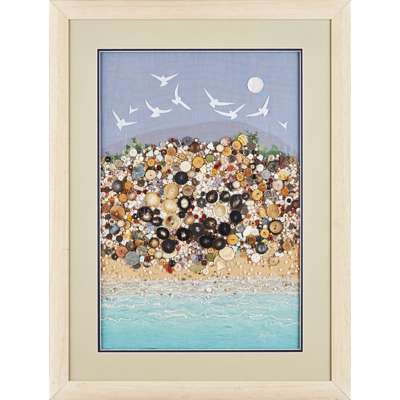 depicting a beach scene, applied felt, buttons, beads and embroidery on a silk ground, embroidered signature JOY CLUCAS, original frame