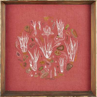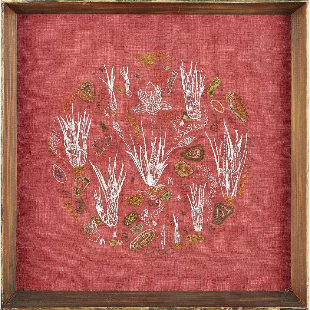 depicting various budding plant forms, on a red linen ground, bears artist's inscription verso, original frame