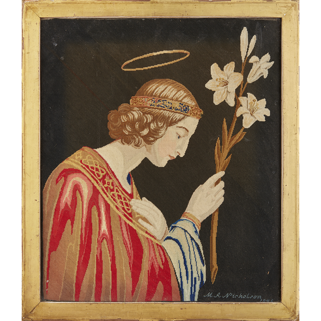 depicting the saint holding lilies, signed and dated M A NICHOLSON 1848, original frame