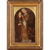 depicting an aesthetic lady contemplating a sunflower, with silkwork embroidery, on a brown velvet ground, original mount and frame