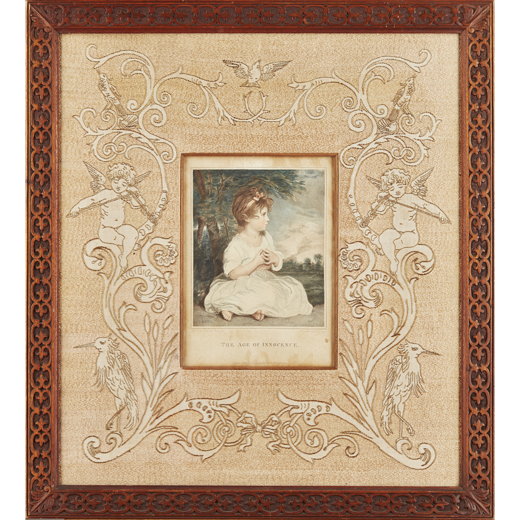 depicting musical putti and birds in a foliate setting, enclosing print entitled THE AGE OF INNOCENCE, after Reynolds, original carved frame
