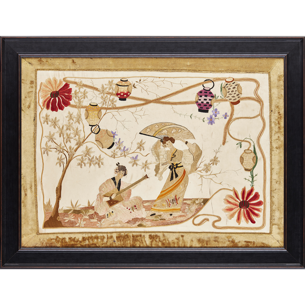 depicting a Japanese musical scene, silkwork reserved on a silk satin ground, within plush slip, framed
