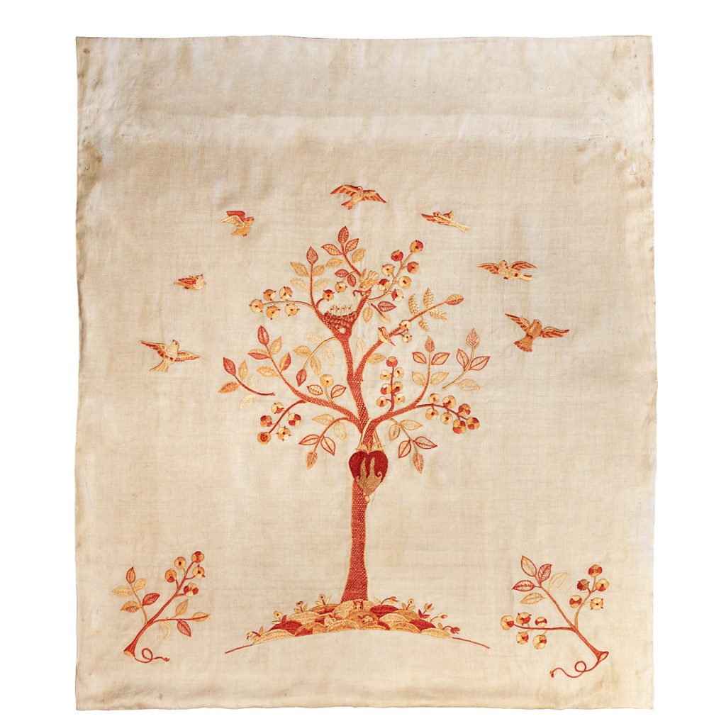 depicting the Tree of Life, russet silk embroidery on a natural linen ground, with later linen backing, bears hand-written label WOVEN BY J.R.S. MACKENZIE/ IN 1893