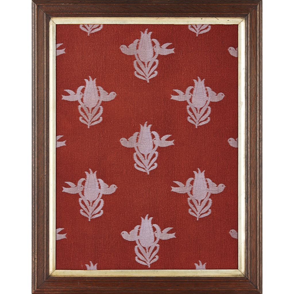 repeating bird and tulip motifs woven on a russet ground, period frame