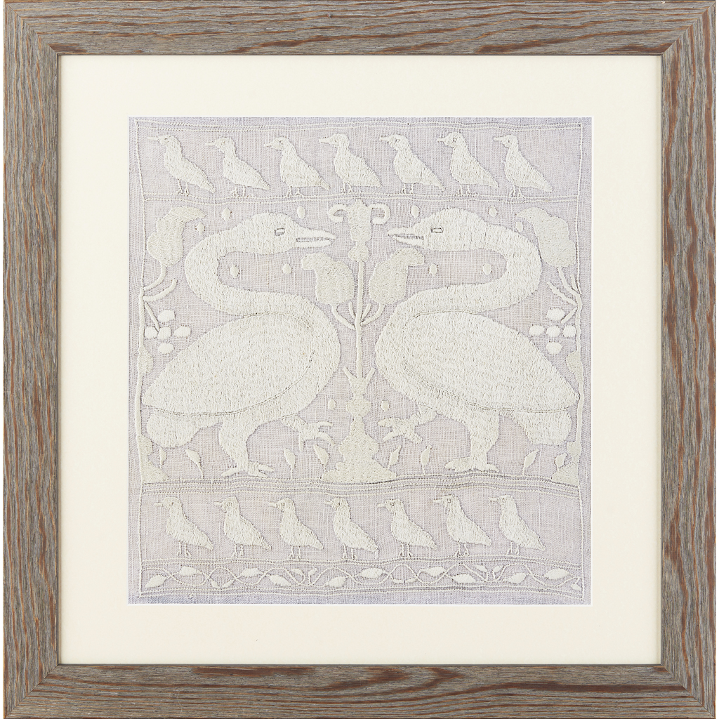 worked in white silk on a linen ground with opposed swans and cygnets, framed