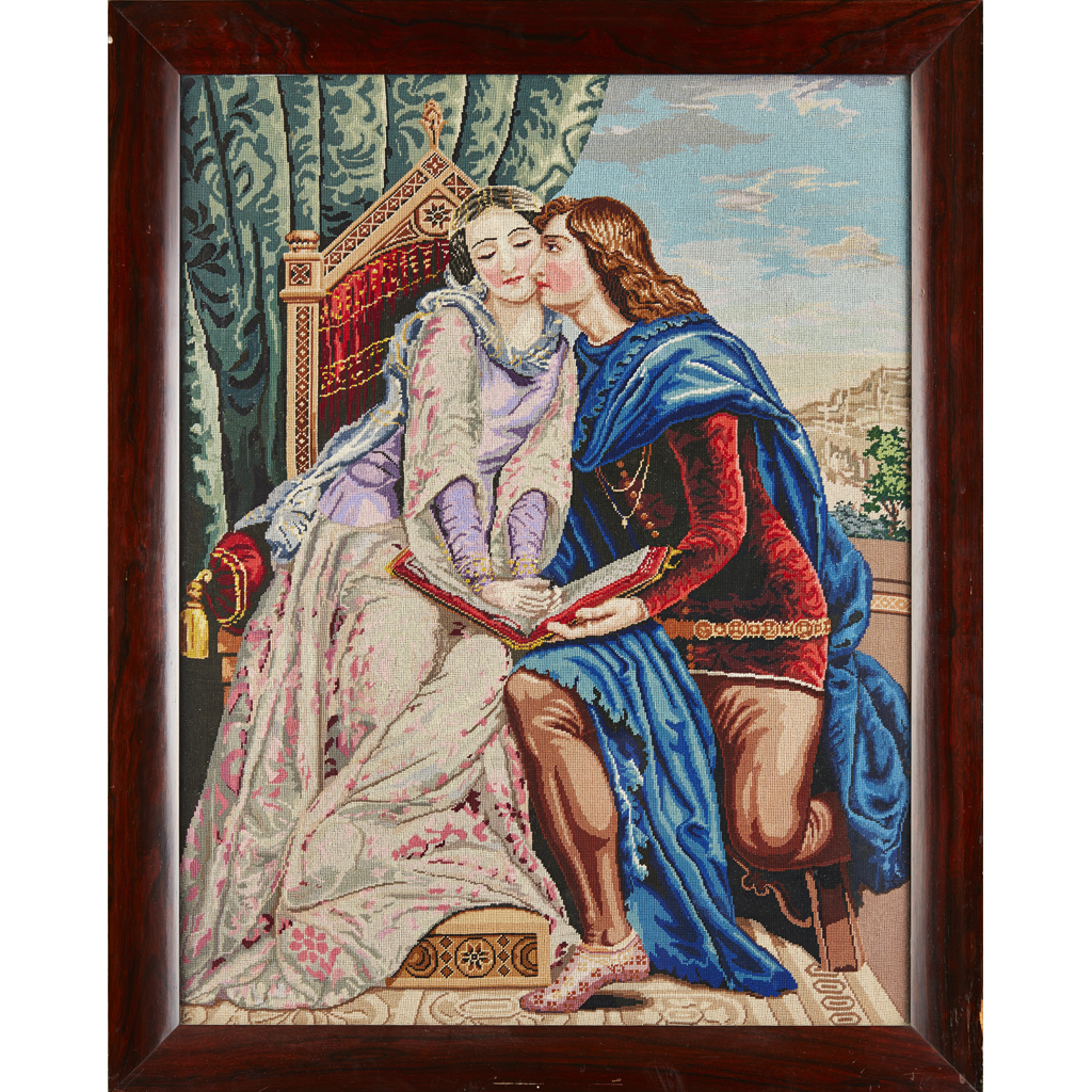 depicting young lovers in medieval costume, within a landscape, woolwork embroidery, original frame