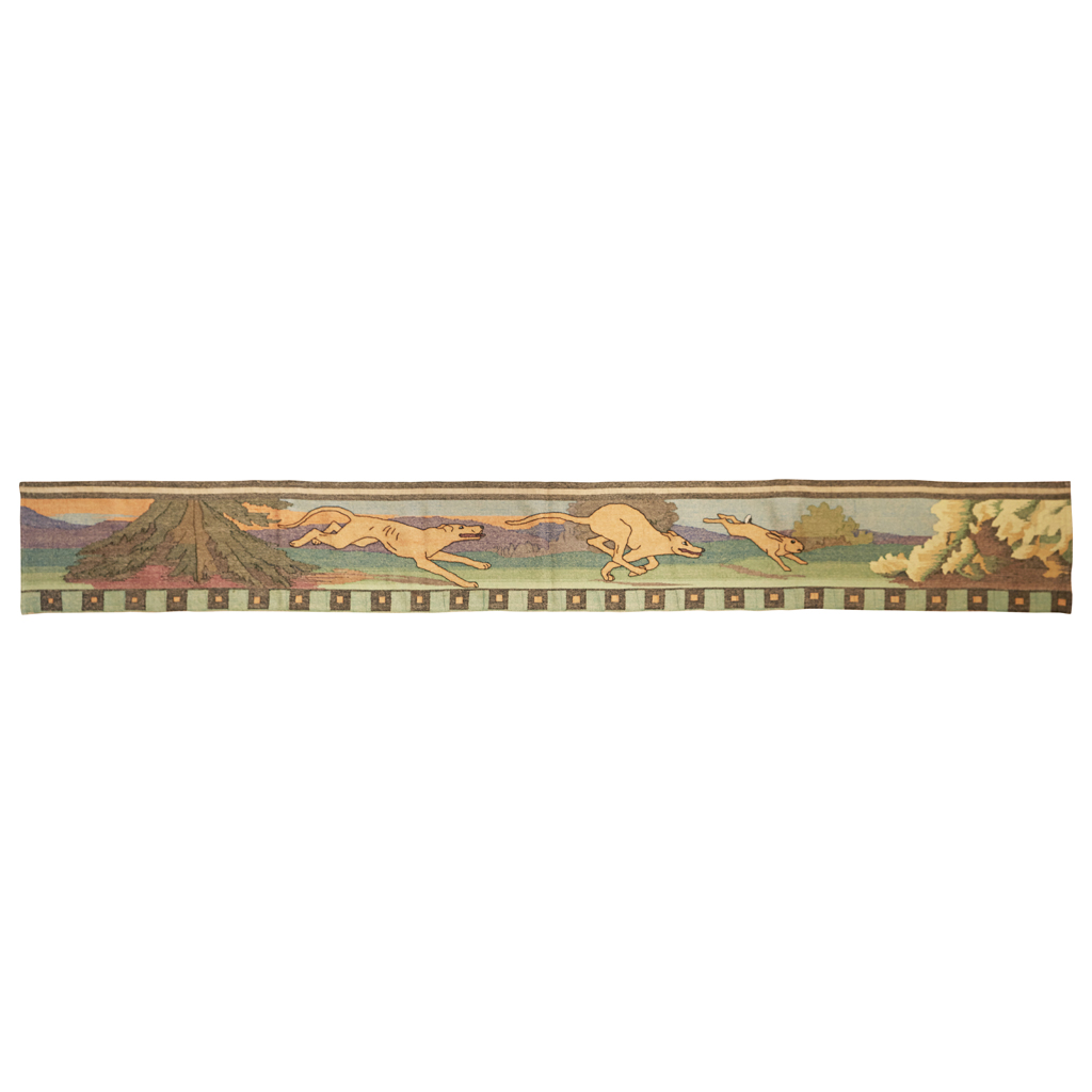 depicting dogs chasing a rabbit in a landscape, wool embroidery on a rough woven linen ground