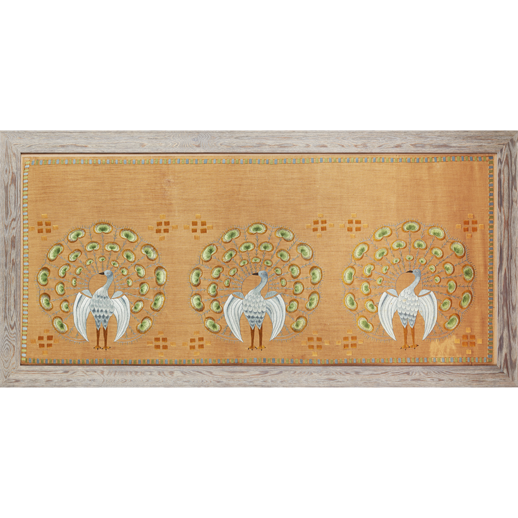 depicting a frieze of peacocks, silk embroidery on linen, framed