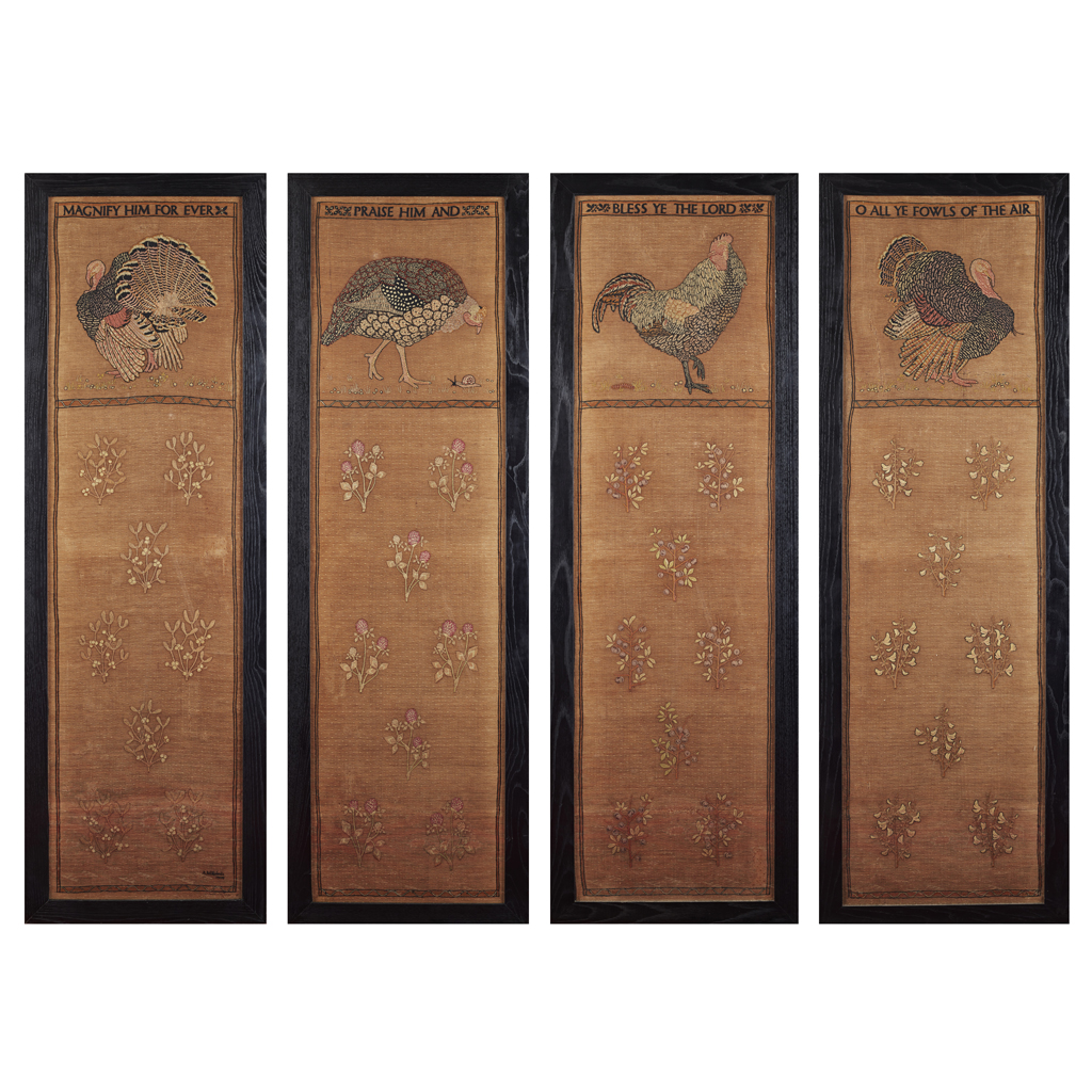 each panel depicting various fowl including a cockerel and a guinea fowl, above fields of various plants and bearing inscriptions O ALL YE FOWLS OF THE AIR/ BLESS YE THE LORD/ PRAISE HIM AND/ MAGNIFY HIM FOR EVER, silk embroidery on a textured linen ground, signed to the base of one panel A.M. ROBERTS/ 1909, framed (4)