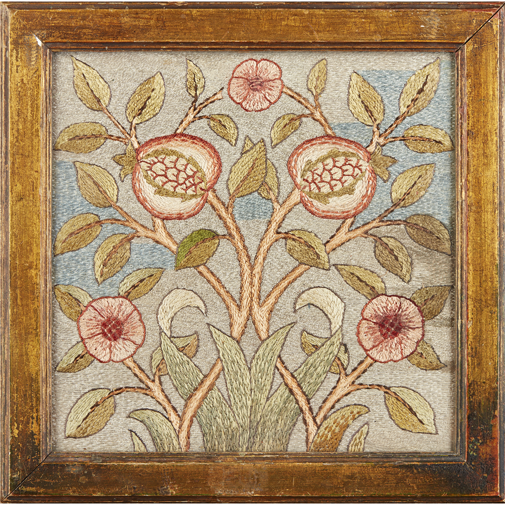 worked as a design of pomegranates, original frame, inscribed with embroiderer's name in pen verso GERALDINE/ 1916
