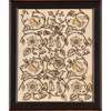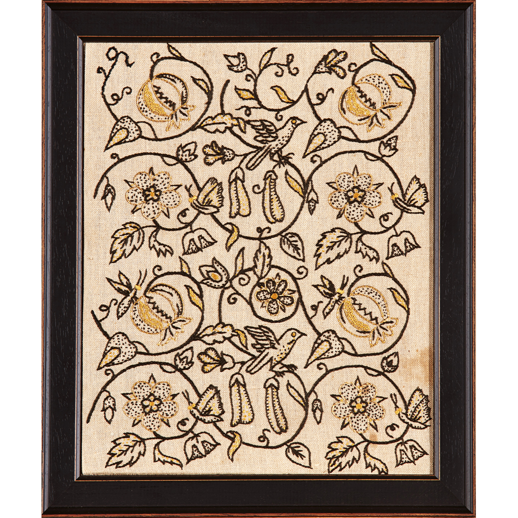 worked in coloured wools and metal threads with a bird and pomegranate design, reserved on a linen ground, framed