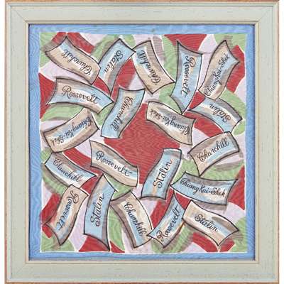 printed with a map of Great Britain and bearing the inscription IT'S A LONG, LONG WAY TO TIPPERARY,/ MY HEART'S RIGHT THERE, framed, 29.8cm x 31cm; and a WORLD WAR II INTEREST SILK HANDKERCHIEF, CIRCA 1945, printed with the names of the Allies ROOSEVELT/ STALIN/ CHURCHILL/ CHIANG KAI-SHEK, framed, 28.5 x 27cm (2)