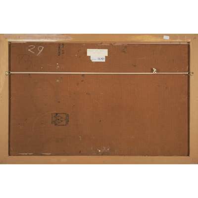 Signed lower right, signed and inscribed to label verso, oil on board