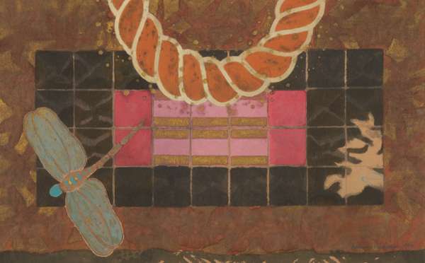 Signed lower right, signed, dated and inscribed with title to label verso, watercolour and gold paint