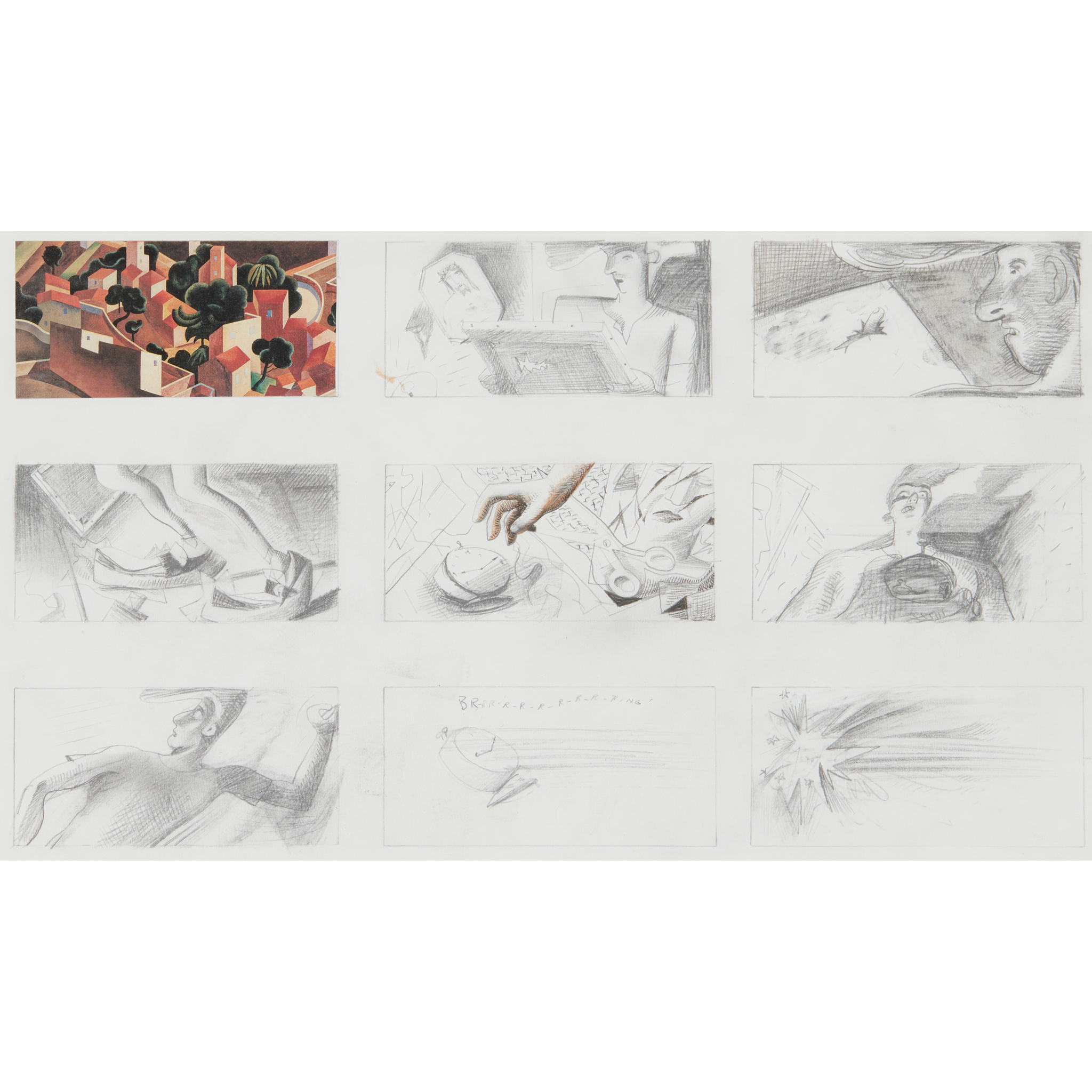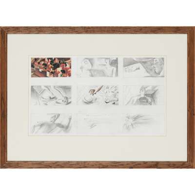 This delightful piece is replete with humorous narrative, a quality which characterised much of John Byrne's work throughout his career. Byrne's experience as a screenwriter and playwright appears to inform ‘Opening Sequence I’, which designs key frames for a scene starring a be-quiffed youth.