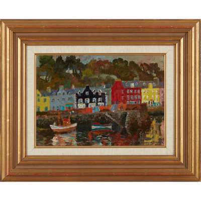 Celebrated for her jewel-toned still lifes and sensitive landscapes, Mary Armour's work is instantly recognisable. Her mature style developed during a tenure teaching still life painting at Glasgow School of Art between 1951-61, where she was exposed to modern European artistic ideas. This inspired her subsequent work profoundly. Armour frequently journeyed to the West Coast of Scotland with her husband and fellow artist William Armour, where the pair drew and painted the landscape. This composition dates to 1972, the year Armour was awarded the Cargill Prize from the Royal Glasgow Institute of the Fine Arts.